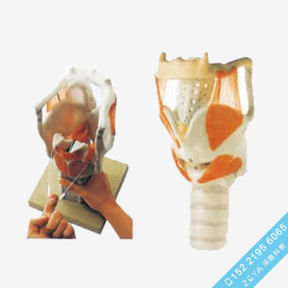 ■该模型显示喉软骨、喉的连结、喉肌和喉腔等结构、环杓关节可运动,模拟开大声门或关闭声门的功能,会厌软骨可上下活动盖住喉口,共有24个部位指示标志。