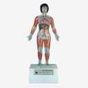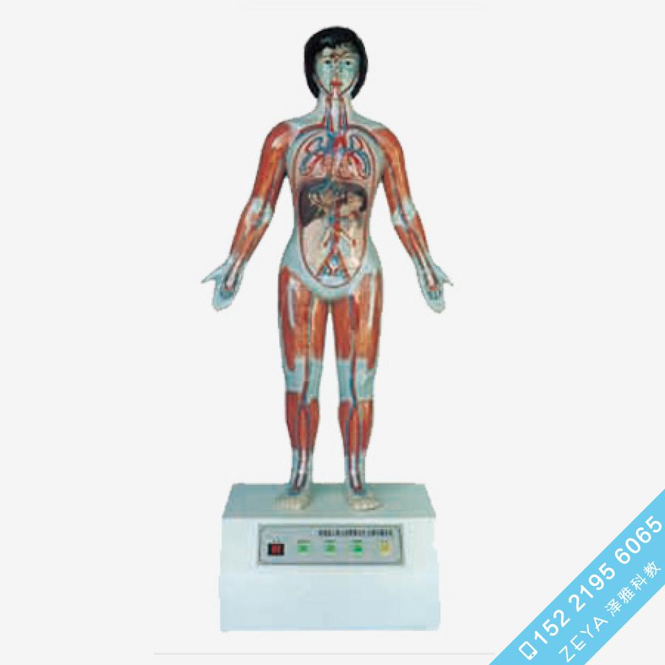 ■ 产品为成人女性,模型身高100CM,宽58CM,总体连底座为58x36x118CM,质材后部采用增强塑料,前部为PVC塑料。动静脉采用红、蓝发光二极管。底座后方有220V电源插座,前上方有全身血液循环、体循环、肺循环、复位四个演示按钮。