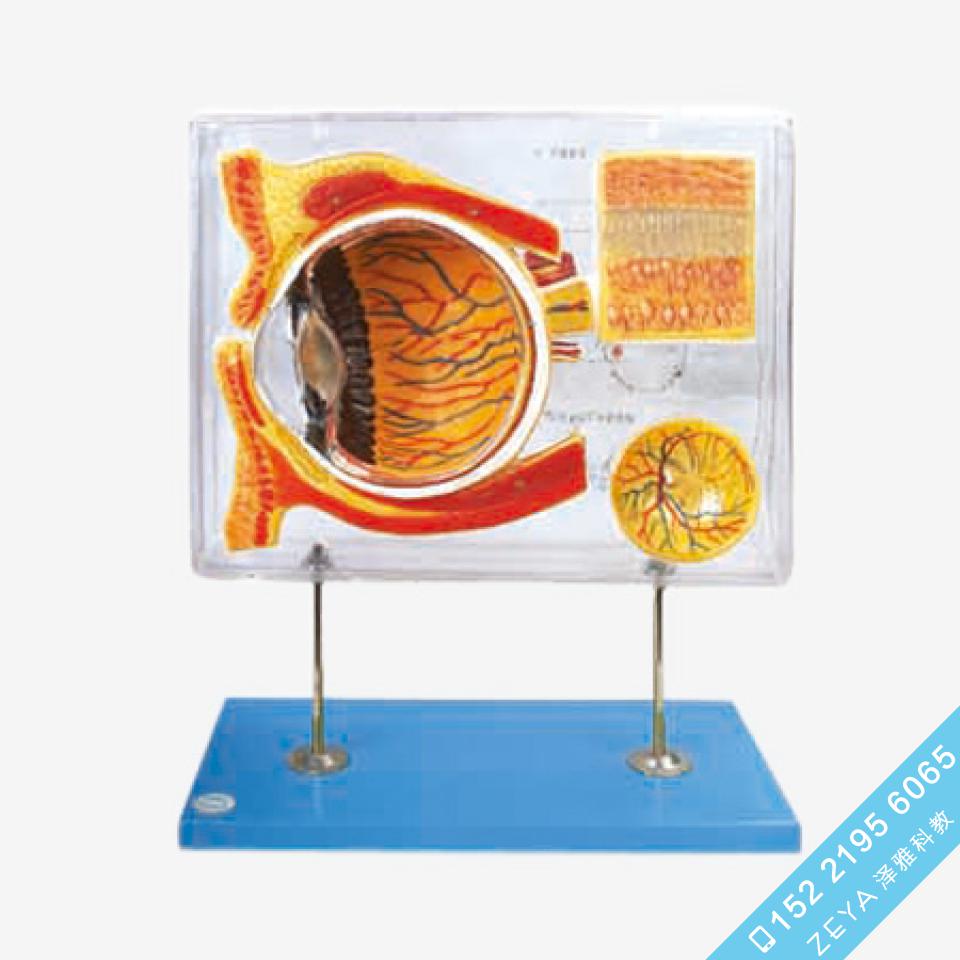 眼示教放大模型置于透明有机玻璃盒内, 为眼球正中切口后的半侧眼球, 可观察眼球正中矢状切面和半侧眼球的外部结构。模型可显示眼球的解剖(包括眼球壁和内容物)、眼副器(包括眼睑、结膜、泪器和眼球外肌)、视网膜神经细胞的显微结构和检眼镜眼底检查视网膜图像等。