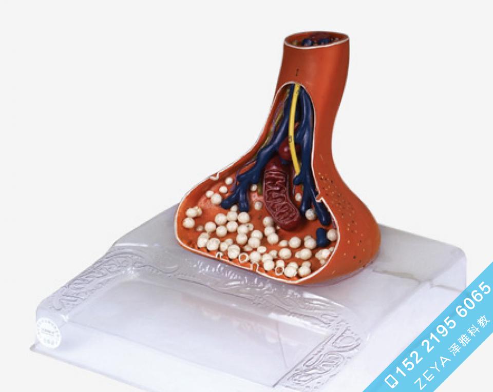 ■ 该模型显示电子显微镜下突触(化学性突触)的放大结构,可观察神经元轴突、突触前膜、突触小泡、线粒体、神经微管和神经微丝等结构,共有9个部位指示标志。