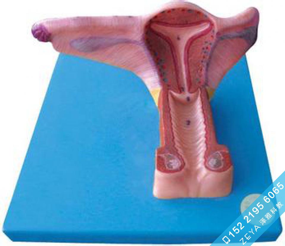 ■该模型前面为子宫和阴道冠状剖面,后面一侧为卵巢和输卵管冠状剖面,并显示女性内生殖器官子宫、卵巢和输卵管等结构,共有19个部位指示标志。