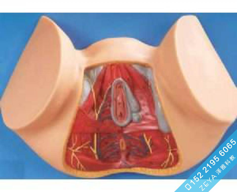 ■显示女性会阴范围、前方的尿生殖三角(尿生殖区)、后方的肛门三角(肛区)以及会阴的解剖结构(包括生殖器官、会阴肌、神经和血管等),共显示20个部位。