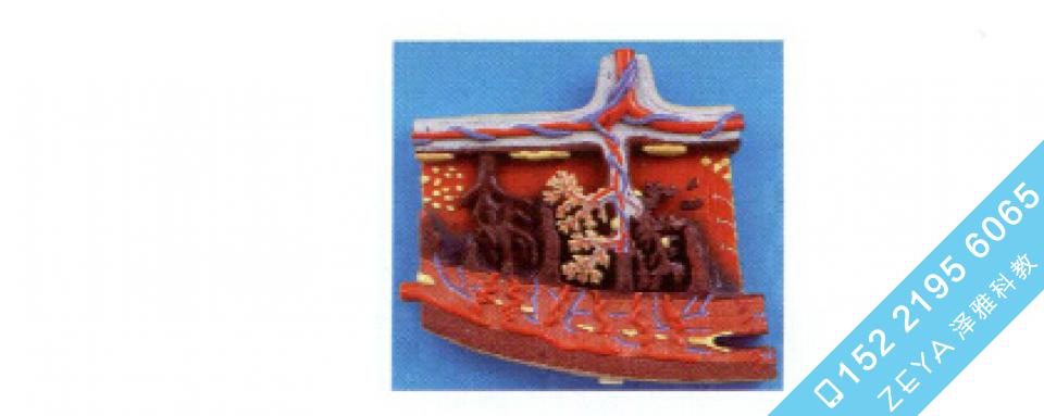 ■该模型显示胎盘组织结构羊膜上皮、丛密绒毛膜、绒毛干、绒毛、细胞滋养层壳和基蜕膜以及脐带等结构,胎儿脐血管红色为脐静脉,兰色为脐动脉,母体子宫血管,红色为子宫螺旋动脉,兰色为子宫静脉,共有14个部位指示标志。