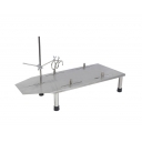 实验时将四只脚铐分别放进台面两侧的四条长槽内,反面用罗帽固定住,可根据动物的大小任意调节,调节长度为150MM。兔头夹立杆安装在台面前部,两条槽任选一条,同样在反面将罗帽收紧。四只脚有橡皮的一头放在下面,将另一头的罗丝取下从台面上的罗丝眼中穿过,将脚固定住。