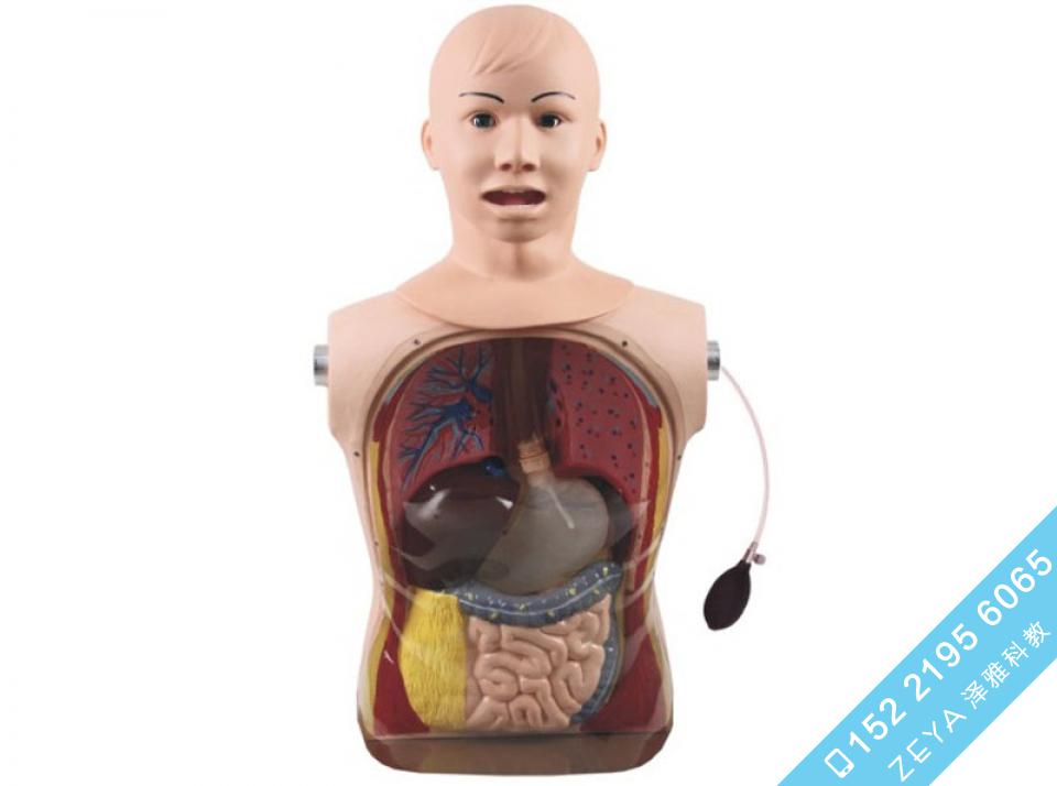 ■ 模拟了一成人男性上半身结构,模型自中切牙至胃内距离在45-55cm范围内,胸壁可打开;可实坐、半坐位。