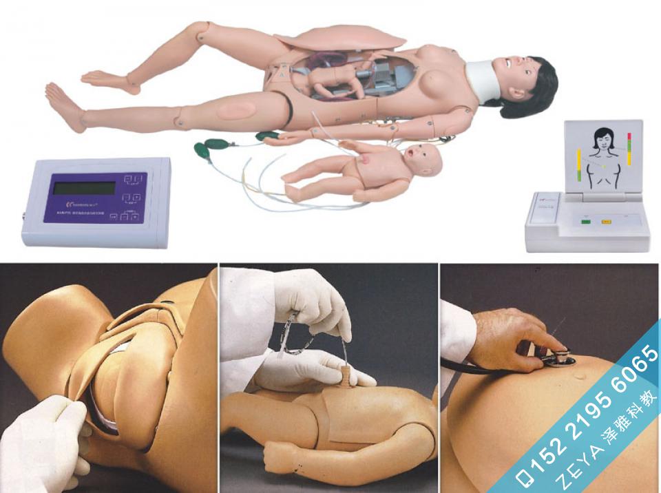 本系统由孕妇、胎儿、新生儿输液模拟人、新生儿急救模拟人和软件组成,模拟产前检查、产中分娩和产后护理。提供典型的正常分娩和异常分娩案例:如正常分娩、脐带绕颈分娩、臀位难产、先兆子痫、剖腹产、脐带脱垂、早产、潜在的产前、产中和产后出血等,指导产科工作者通过产程图辨识分娩的不同产程阶段,临床诊断异常产程,并合理处理;通过胎儿的临床监护,及时诊断胎儿宫内窘迫,并实施处理,训练新生儿的护理及急救。
